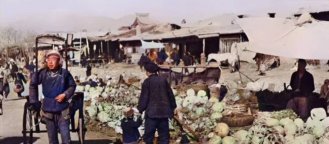 最后这一幕是菜市,篷布撑开一片阴影,卷心菜堆成小山,卖菜人手里攥着秤杆,嘴上还在和价,孩子蹲在边上掰梆子皮儿玩,推车的在旁边喘两口粗气,那时候买卖讲个诚字,现在扫码嘀一下更利索,热闹的味道却一个样。