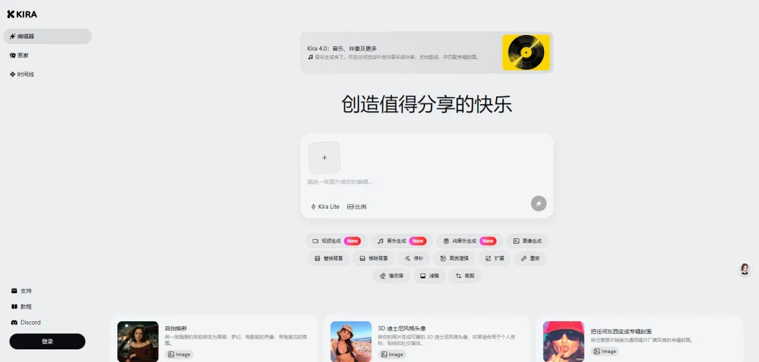 Kira 是一款专业 AI 图像生成与编辑工具,基于智能视觉技术,覆盖背景处理、画质修复、图像扩展、风格转换、AI 生图等全流程修图功能,操作简单、效果专业,满足设计师、摄影师、电商从业者及普通用户的各类图像处理需求。