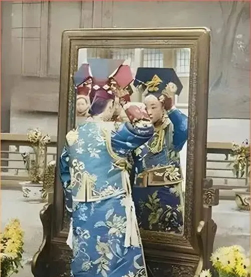 图中这面大立镜叫铜胎镜框,摆在照相馆里才见得到,贵妇对着镜子把旗头上那撮花枝挪了挪,蓝地缎面满铺缠枝花,腰间一条织金带勒得齐整,镜里镜外两层人影挤在一块儿,忙活半天就为拍到位,一个针脚都不想歪。
