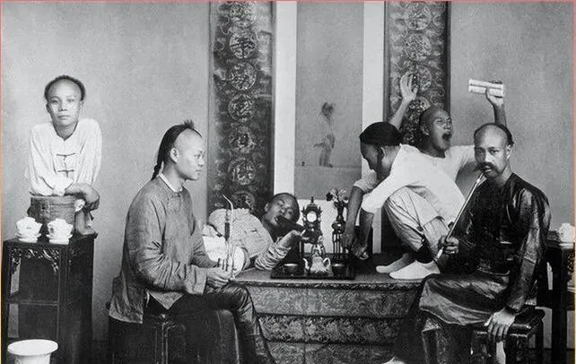 这一屋人的案上靠的是水烟袋和鸦片具,摆在正中不避讳,几个人或躺或坐,神情散下来了,桌上小钟摆着,墙上挂着字画,生活不只端着,也有散懒的时候,老照片把光鲜和阴暗一并收住,留下的都算实话。