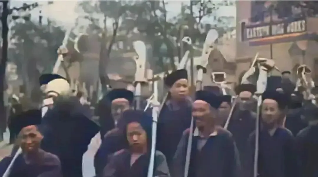 照片中拿着各式武器的人们是去参加晚清时期召开的武林大会,当时的武林大会是由官府参与举办的,通过这种方式来选出佼佼者为政府所用。