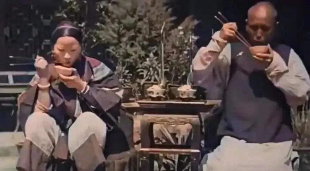 一户有钱人家的夫妻二人正坐在院子里吃饭,通过他们的穿着与周围的摆设可以看得出来应该是一个大户人家,但是他们吃的饭却很简单。