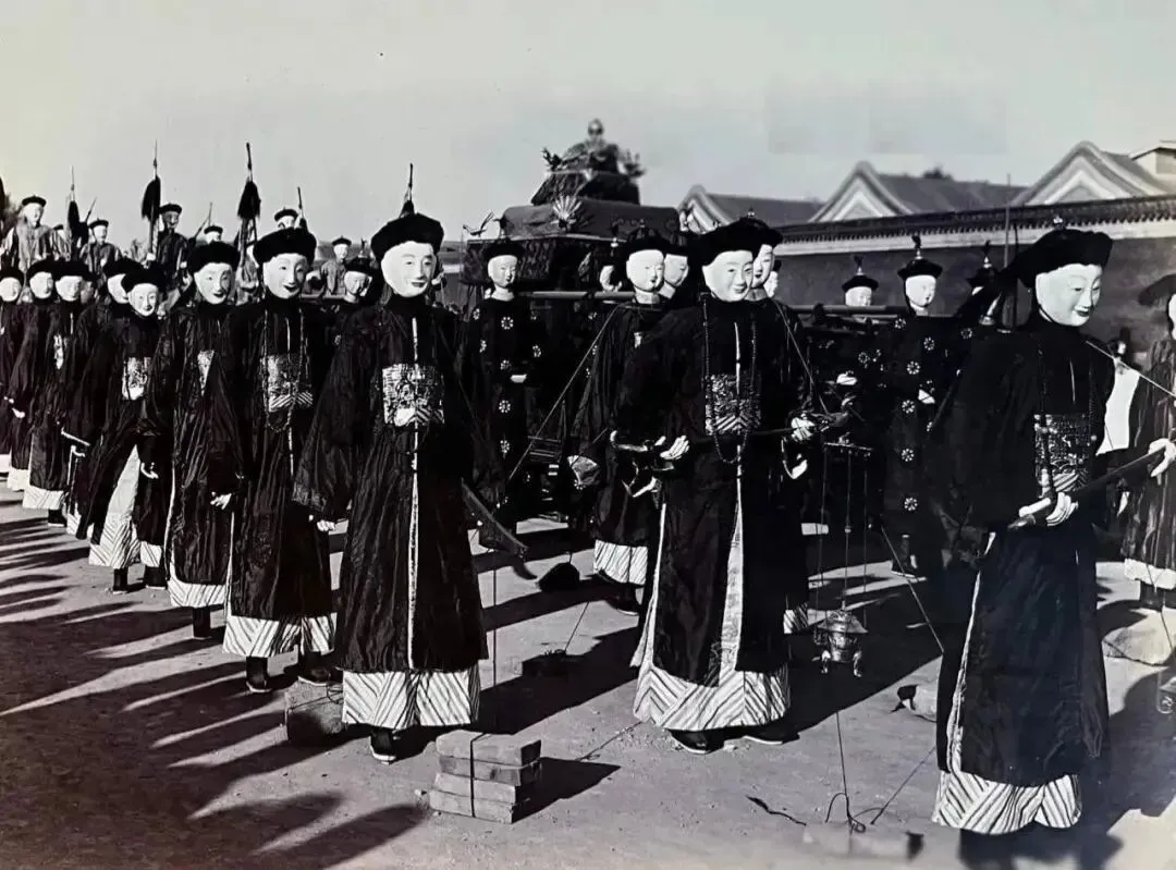 照片中一列又一列站着的“人”是要烧给病逝的慈禧太后的纸人,不光有站立的,后面还有骑在马上的,不得不说古时艺人的手艺真的是很好。