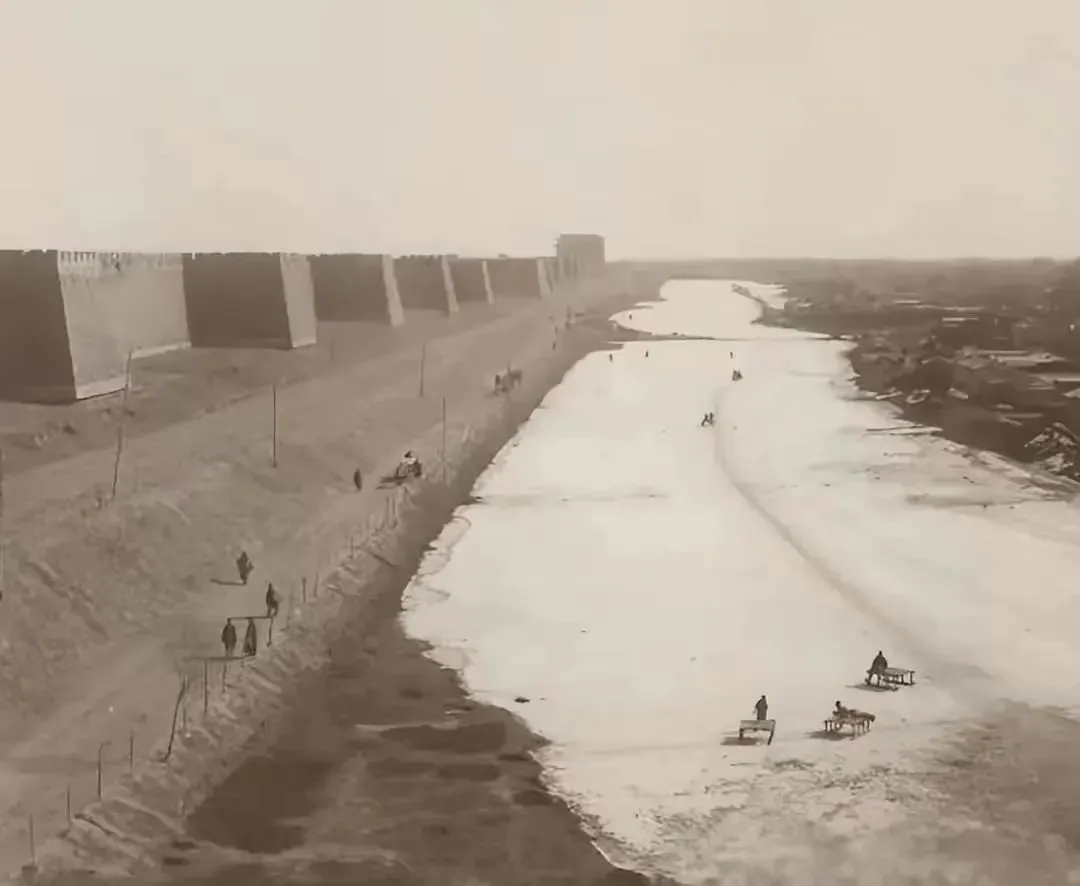 冬季的护城河已经结上了冰,可以看到在冰面上有正在玩着冰床的人们,那个时候的冰床就相当于现在爬犁,是一种冰上游戏的工具,只是要比爬犁大上了许多。