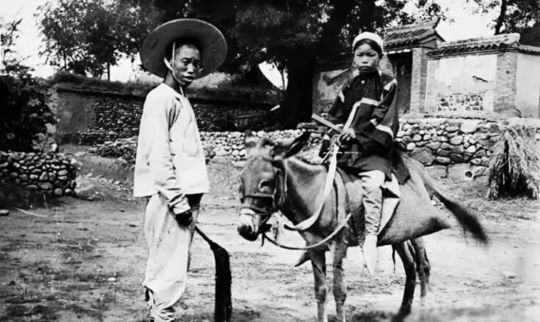 一对夫妻正走在去老丈人家的路上,坐在驴背上的妻子看起来也就十几岁的样子,之所以要骑着驴走是因为她裹着的小脚走不了太远的路。