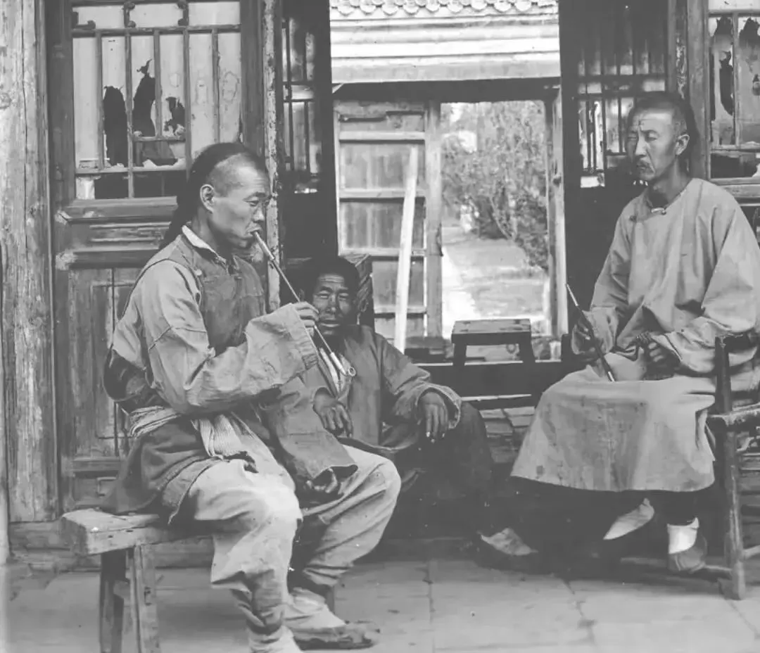 几名落魄的八旗子弟正聚在门口抽着烟袋,在晚清的时候有很多的八旗子弟都没有了经济的来源,日子过得是一天比一天差。