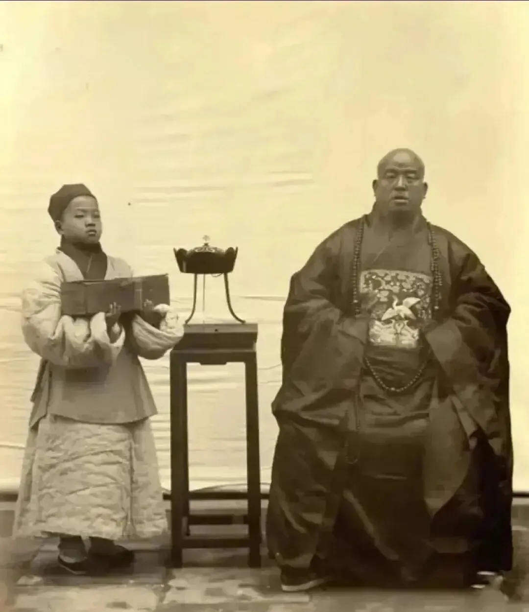 照片中是一名穿着官服的胖和尚,在清朝晚期的时候官员的职位是可以买的,在那个时候叫做捐官,只要有钱,就可以到政府去买一个。