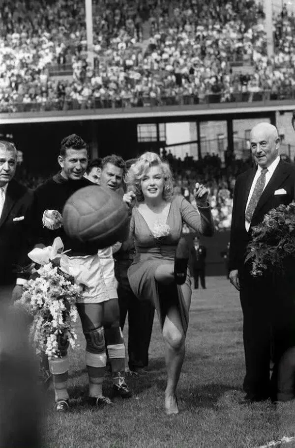 现在开⚽️:1959年,玛丽莲梦露在纽约为美国对以色列的足球比赛开球 。