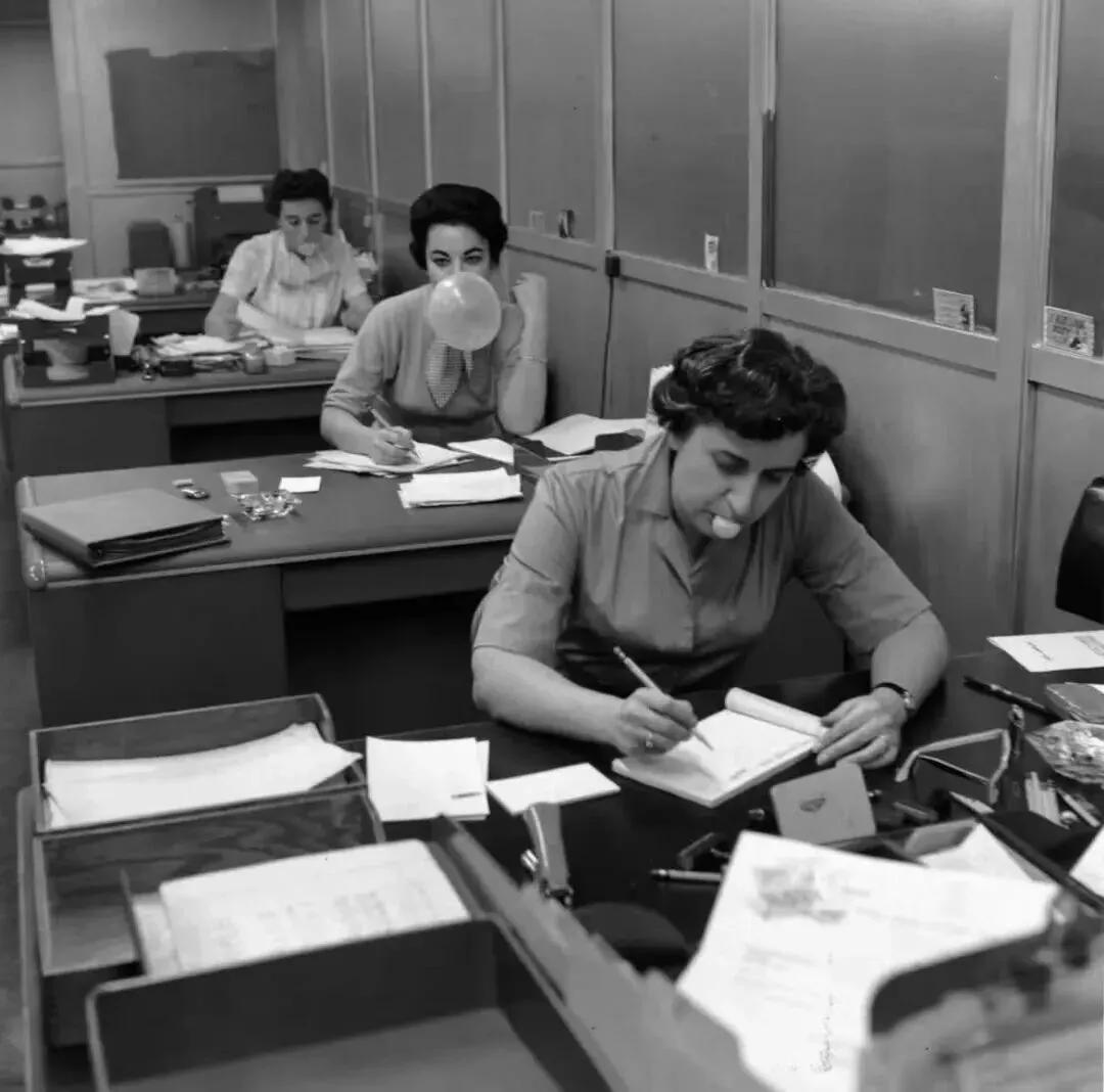 还是上班好嗨森!1960年1月,纽约 Topps糖果工厂从本月开始,向员工们提供无限量本公司的糖果,女会计们一边嚼泡泡糖一边工作 。