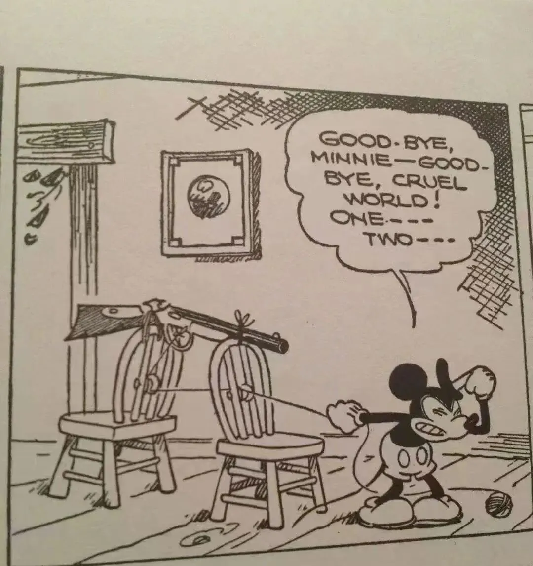 在战争年代哪怕是孩子们喜欢的米老鼠,也会抑郁没见过吧。在老版米老鼠报纸漫画里,有一段情节是他不断试图自杀。现在迪士尼乐园里的米老鼠就快乐多了。