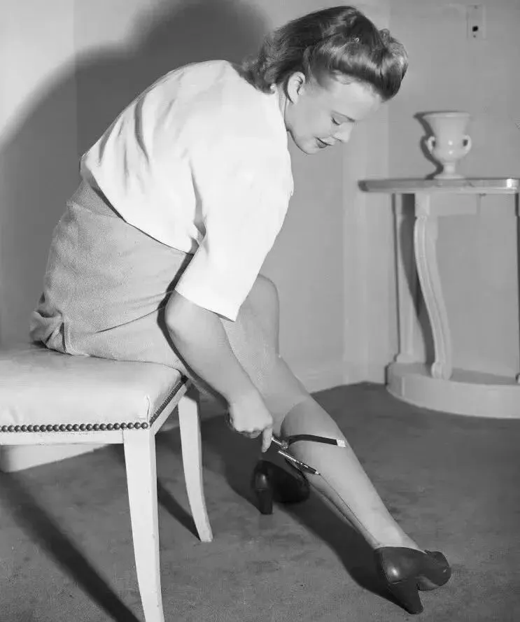 而二战时期的妇女没有尼龙丝袜,在光着的腿上画一条条带,模仿丝袜的接缝。当46年英国商店里卖的最好的是假肢🦾成为历史,人们发现用于战争的尼龙越来越多成为女人扮美的丝袜的时候才意识到战争真的结束🔚了。