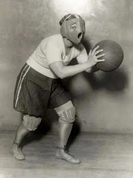 这形像是不是如同萌的一样一样的1927年美国,打篮球的特殊防护面罩和护膝。