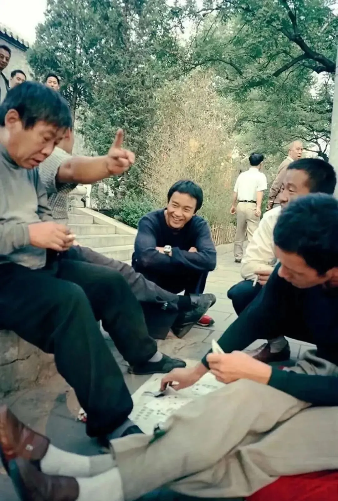 :1992年,地坛公园,拍摄《霸王别姬》时的张国荣,蹲在地上看人打扑克牌。