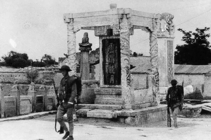 二十九军浴血抵抗,第29军副军长佟麟阁、第132师师长赵登禹壮烈殉。7月28日夜,宋哲元率部撤离北平。图为1937年7月29日,北平沦陷,日军进入北平正阳门。