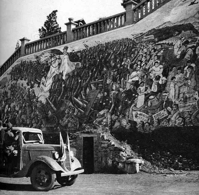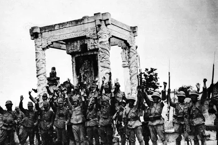 1938年1月到5月,徐州会战开始。1938年4月,在李宗仁的亲自指挥下,中国军队取得了台儿庄大捷。歼灭日军2万余人,缴获大批武器、弹药,严重地挫伤了日军的气焰,是国民党战场在抗战初期取得的一次大胜利。图为取得台儿庄大捷后的中国军人。