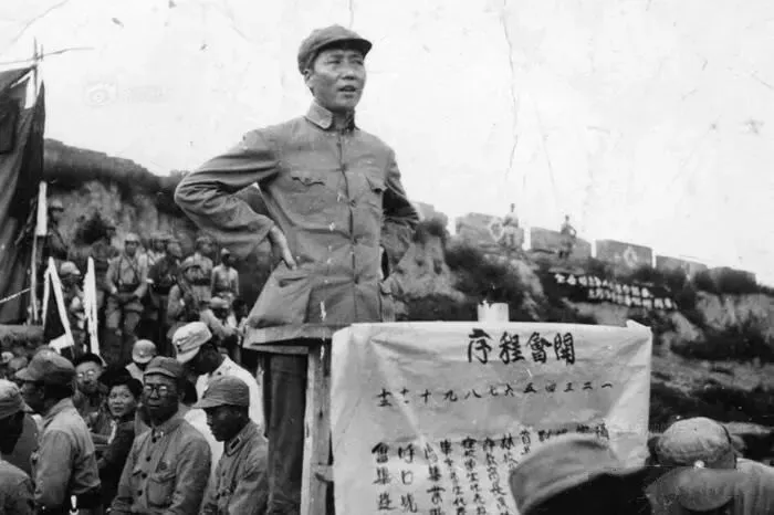 七七事变的第二天,中国共产党中央委员会就通电全国,呼吁:“全中国的同胞们,平津危急!华北危急!中华民族危急!只有全民族实行抗战,才是我们的出路!”图为毛泽东在延安抗日军政大学讲话,号召一致抗日。
