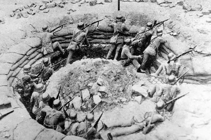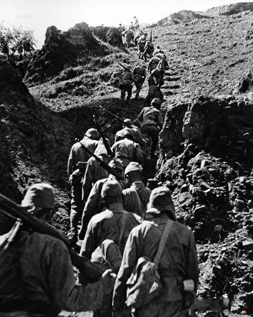 1943年11月,日军纠集7个师团约10万人进攻常德,国军集中了第六战区和第九战区的16个军43个师21万人迎战。中国军队给敌重大消耗,击毙日军1万余人。参战的国民党主要将领:孙连仲、王敬久、王耀武、余程万、施中诚、胡琏、池峰城、张灵甫。图为进攻常德城的日军。