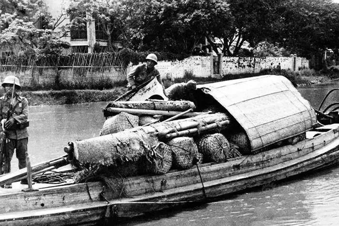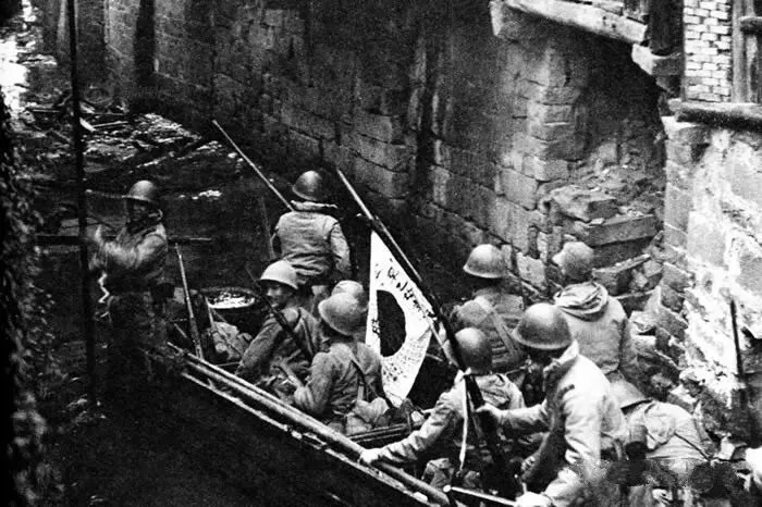 1939年6月6日,日军大本营下达攻占汕头一带要地的命令。6月21日是农历五月初五端午节,日军趁机对汕头市进行突袭。图为日军乘舟进入汕头市区。
