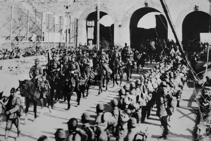 南京陷落之前,1937年10月至11月,中国第二战区部队在阎锡山的带领下同日军华北方面军在山西省北部、东部和中部地区进行的大规模的战略性防御战役,称“太原会战”。“太原会战”结束后,阎锡山将行营设在临汾。1938年2月,临汾失守。图为日军骑兵进入临汾城。