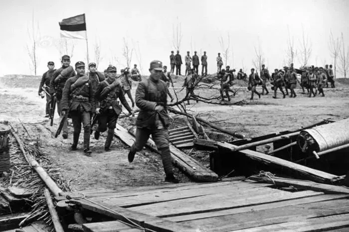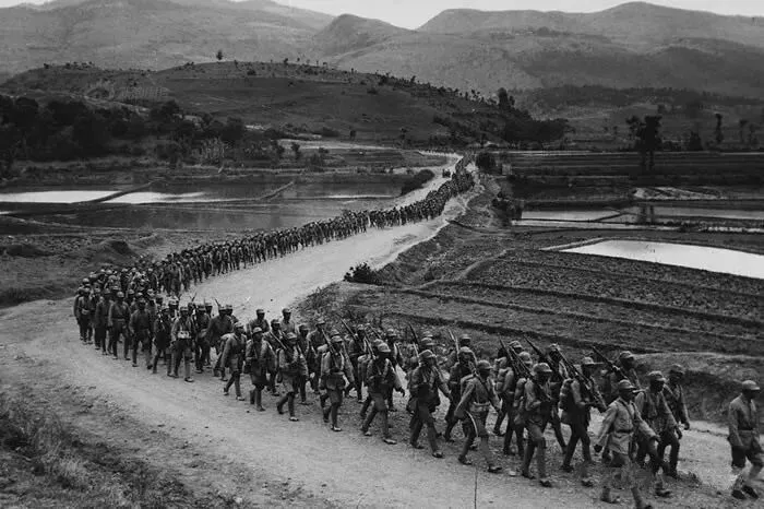 武汉沦陷后,日军并未停止进攻,岳阳沦陷才标识武汉会战的正式结束。1938年11月11日,岳阳被日军占领。11月13日,长沙当地驻军长官朱鹤松以奉蒋介石“焦土抗战”的密令为名,于凌晨2时在长沙城内数百处同时放火,史称“文夕大火”。图为日军在洞庭湖畔行军。