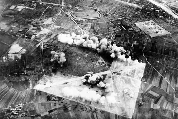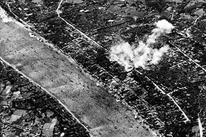 1944年4月,日军发动豫湘桂战役,衡阳会战成为豫湘桂战役的最重要阶段。中国陆军第十军守卫衡阳,军长是方先觉。第十军以1.8万人对抗11万余日军,历时长达48昼夜,中方伤亡1.5万余人,日军伤亡6万之众,导致日本首相东条英机下台。图为日军轰炸衡阳城。