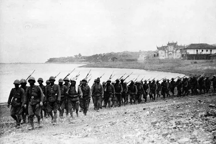 到1938年10月,广州成为中国最重要的港口,但是中国军队防守却很松懈。粤军被抽调半数去参加武汉会战。武汉会战中国军顽强抵抗,使得战局进展缓慢,日军大本营等不及了,迅速抽调三个师奇袭广州。广州于10月21日下午沦陷。图为日军在广东龙江。