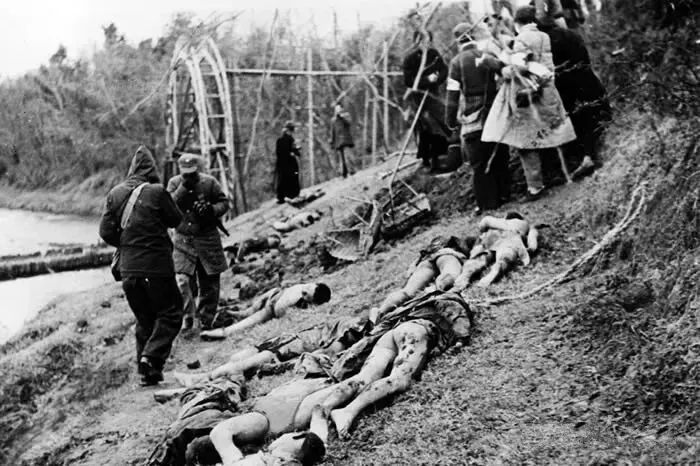 1942年,第三次长沙会战后,日军在渡过浏阳河的过程中遭到中国军队的猛烈反攻,大批日军在战火中丧生。图为中外记者以及红十字会人员在战场,他们的脚下是日兵尸体。