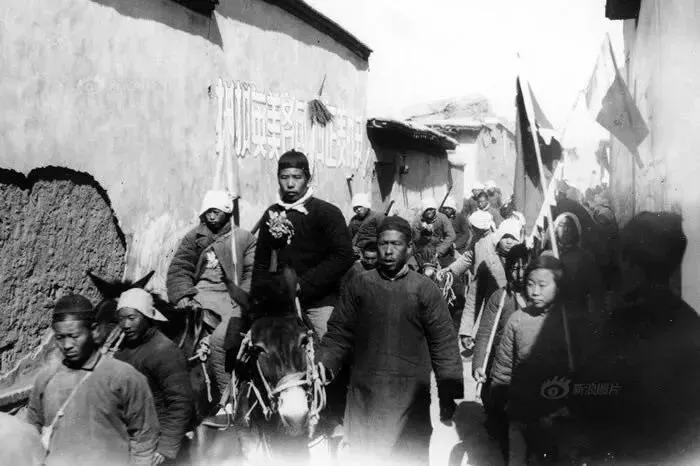 1942年,晋察冀边区,河北平山县村民刘汉兴告别父母,志愿参军,图为刘汉在村民举行的出征仪式中。