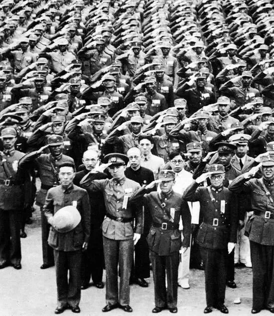 抗战时期,国民政府的军队将领和部分文官向蒋介石致敬。