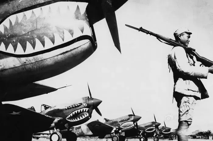 1941年8月成立的“中国空军美国志愿大队”又称“飞虎队”,在中国抗战中做出了巨大贡献,也付出了惨烈牺牲。滇缅公路被切断后,他们飞越驼峰航线,将美国给中国的援华物资从印度空运至中国昆明。图为飞虎队的鲨鱼头飞机。
