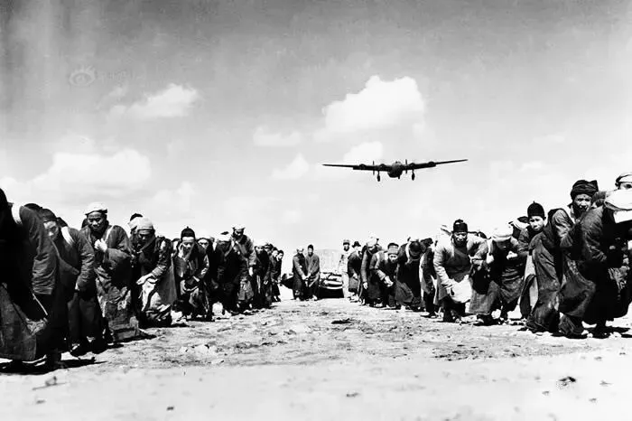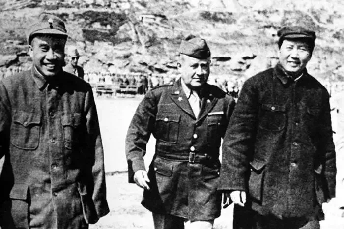 1944年,国民党军队在豫湘桂战役中出现了大溃败,罗斯福深感失望。7月和8月,美军观察组分两批先后抵达延安,观察和了解敌后战场八路军和新四军的作战情况。图为1944年11月1日,毛泽东、朱德等和美军观察组组长包瑞德上校在延安机场检阅奉命出征抗日的八路军战士。