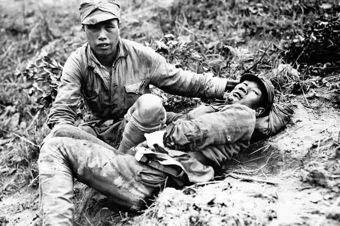 1942年,第三次长沙会战中,中国女后勤兵协助在战场受伤的国军士兵行走。