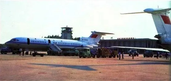 画面中,中国民航的三叉戟客机静静停在停机坪上,尾翼上的鲜红国旗在阳光下格外显眼。远处的塔台与朴素的航站楼,没有现在的高科技感,却透着那个年代中国民航起步的质朴与郑重。
