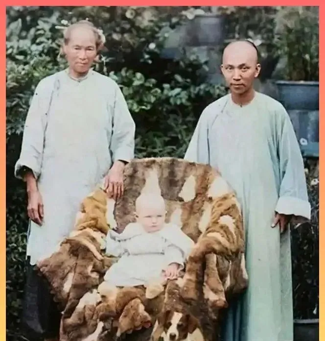 这张院子里的合影主角不是人,是那把椅子,这个大物件叫太师椅,外头裹的不是普通皮毛,花纹一片一片接得紧,厚实得能埋进半个手背,坐面往里兜着,边沿翻得高高的,像把人包进去,怀里那娃儿才巴掌大点,手搭在边上,掌心白得晃眼,椅脚没露全,却能看出尺度不小。