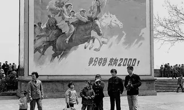 14.宣传墙上,画着奔腾的骏马,和骑在马上的工人,还写着“争分夺秒 奔向2000!”。