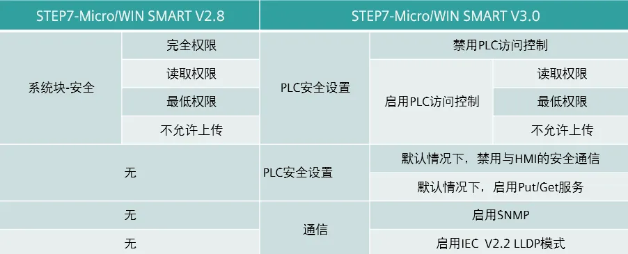 S7-200 SMART V2.8的项目迁移到S7-200 SMART V3.0安全设置的迁移如下表所示。
