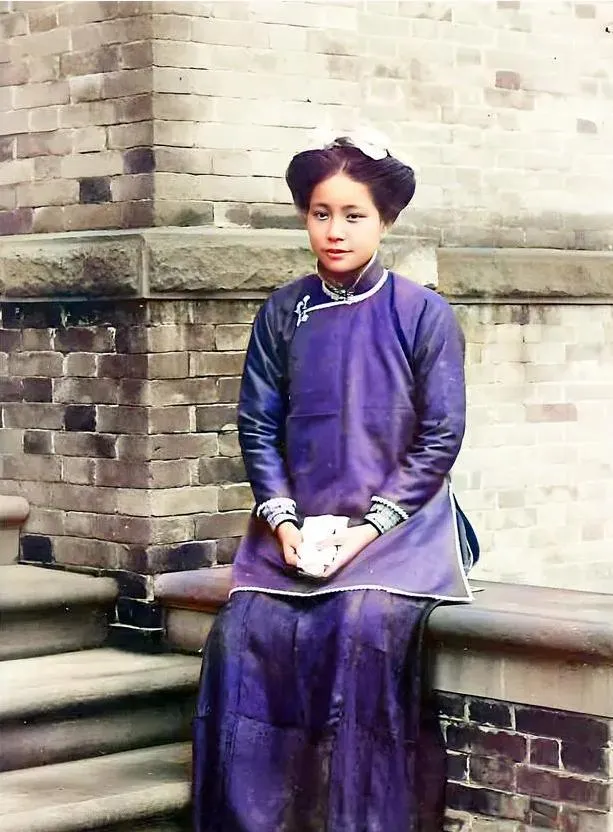 谁说时代变了,美人就会失色?看看成都街头的变迁,百年前一位清秀民国蓝袍女孩,坐在院墙台阶,安安静静。