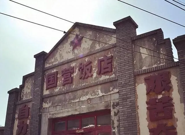 图中这座门头,就叫国营饭店,老房子灰扑扑的墙皮,一块大招牌在檐下立着,几个大字都磨得没了棱角,上面一颗红星,怎么看怎么亲切,那会儿镇上的饭店就这么几家,招牌都是这一身板儿,一到饭点,门口排队的人足有一二十米,伸脖子往里瞅,心想今天舀上一勺饭,算是过回城里人的瘾。