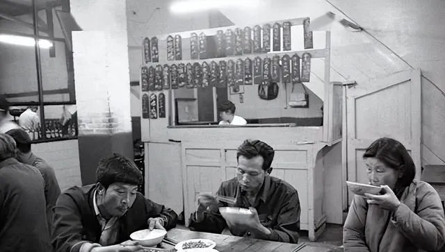 那时候吃饭讲究个“快”,饭店里坐着的这几个食客,全都埋头苦吃,瓷碗、铁勺敲得哐哐响,谁也不管旁人动作大不大声,一上菜就低头干活儿,碗里的粉丝、肉片、豆腐纷纷下肚,有人喝面汤一气仰脖搅到底,还得用袖口擦擦嘴,吃饱了吧嗒一下嘴角,“这顿够实在”,要说什么菜最受欢迎,十有八九就点老三样:肉丝粉条汤、炸油饼、醋溜豆芽,手里攥着票,是花得最值的饭钱。