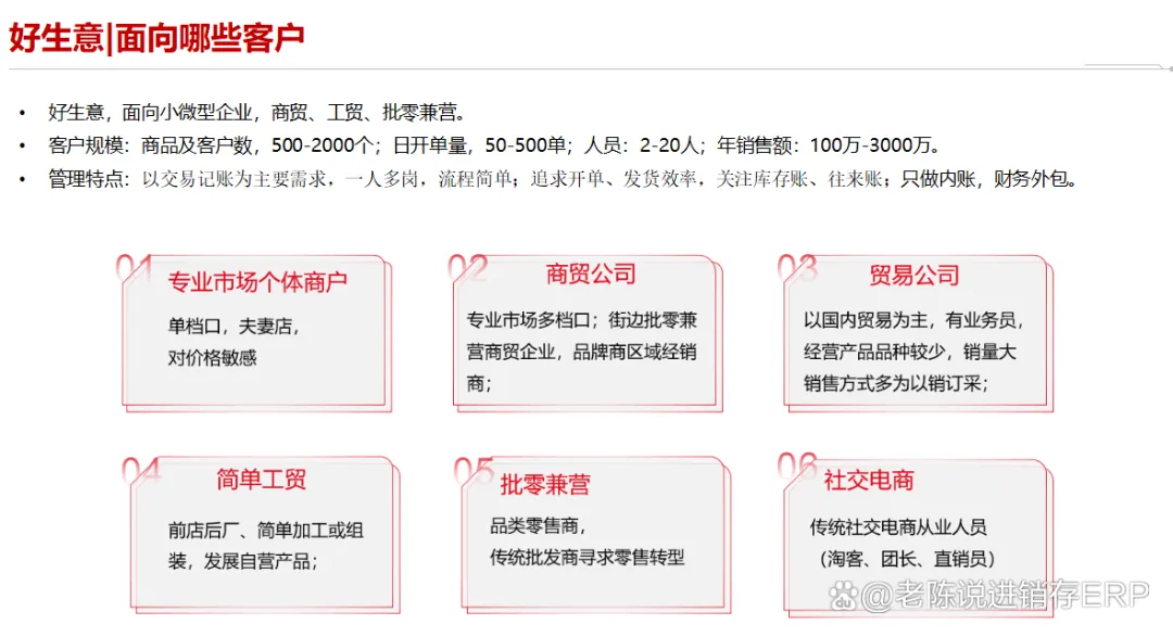 基于小微企业数智化需求,畅捷通推出一系列SaaS产品,包括好生意(面向微型商贸及零售企业的数智商业SaaS产品)、好业财(面向商贸、零售、项目服务业的SaaS产品)等,已为超过960万家小微企业提供数智财税及数智商业服务。
