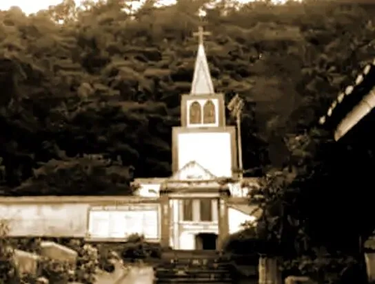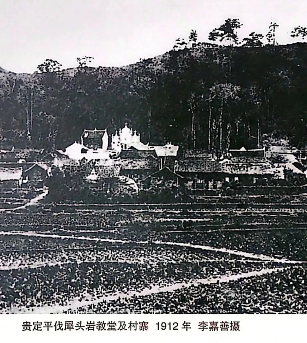 李嘉善神父是继贵州主教白思德望以后,贵州天主教传教士著名的摄影师之一,这是他他拍摄的贵定平伐犀头岩教堂远景照片。