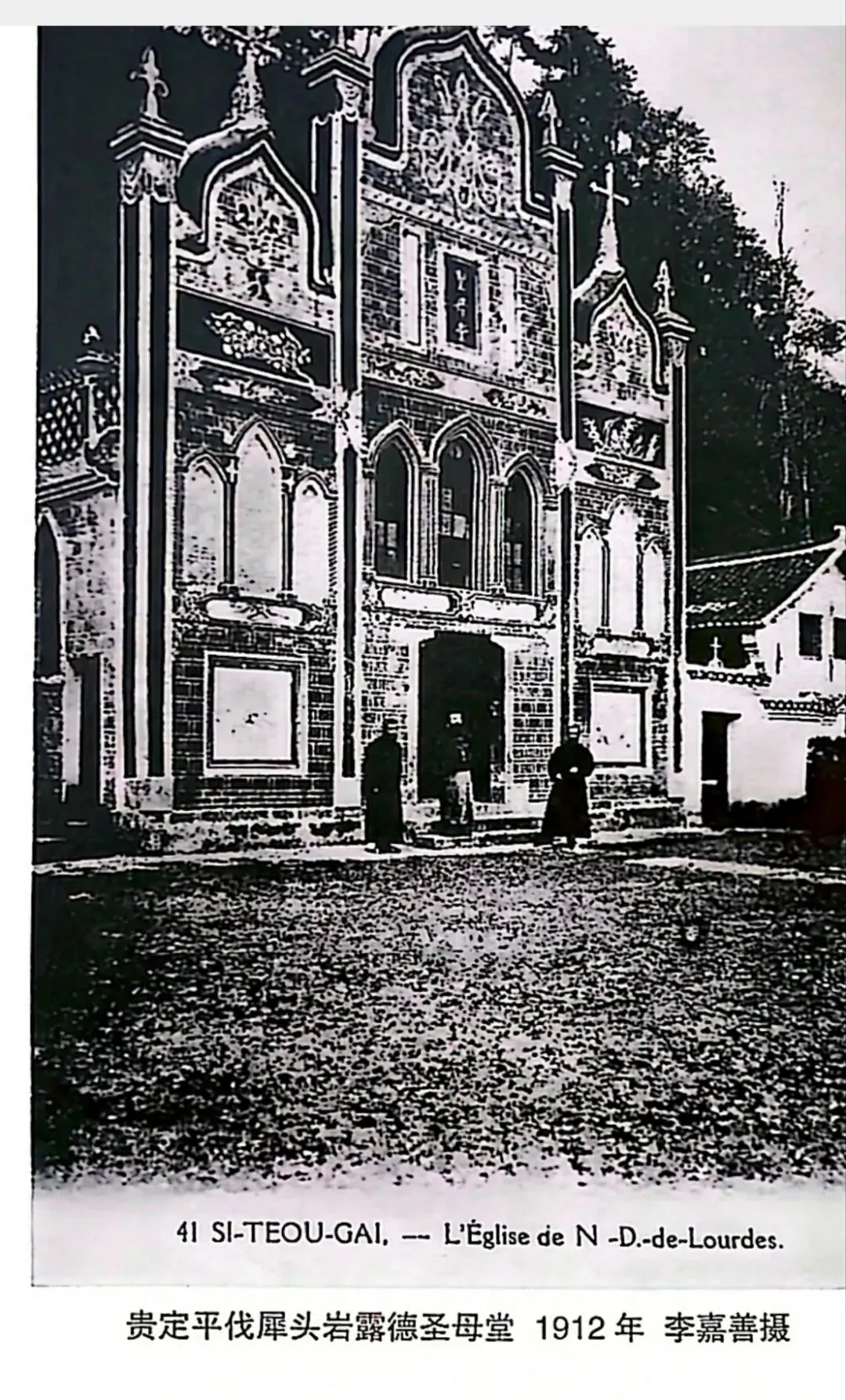 这张珍贵老照片也是李嘉善神父的摄影作品,一位神父和两位教友在当年犀头岩圣母堂前。
