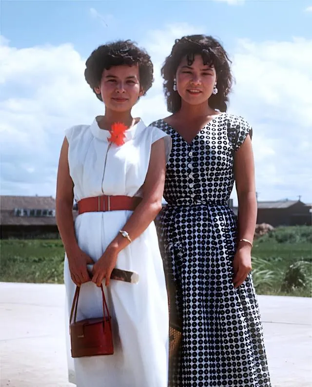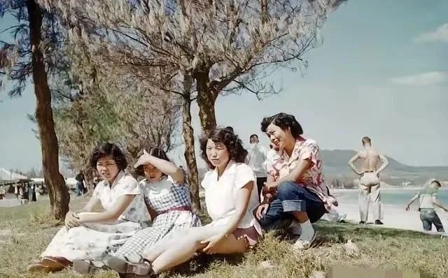 说点轻松的,那个年代的琉球姑娘,真的挺亮眼!**美式裙装、时尚耳环、精致腰带,配上大大的笑容,站在蓝天白云下,美得特别有活力。**外来的流行风把琉球吹得不一样,连年轻人的姿态都特开朗,和老照片里的战争阴影截然不同。
