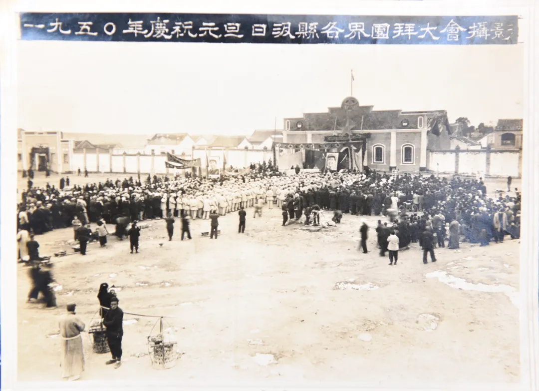 现场会标书写顺序仍按旧例自右向左,照片题字已比较新式了,从左往右。