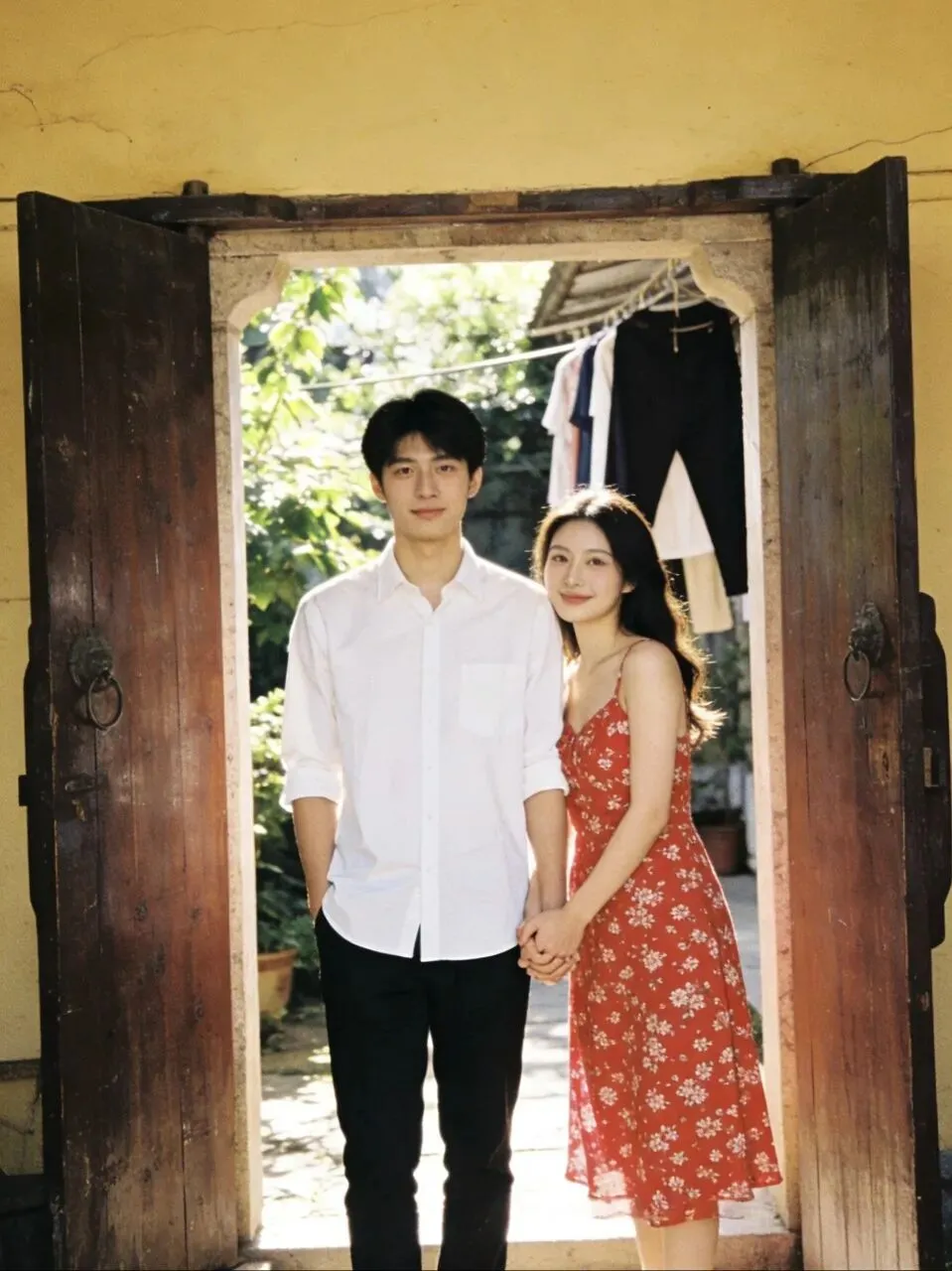旧门、藤椅、红囍,皆为证也。昔年青涩相携,今朝白首之约,阳光穿牖,影落同心。此四帧影像,非徒留形骸,实乃千年一遇之良缘,万古流芳之佳话也。