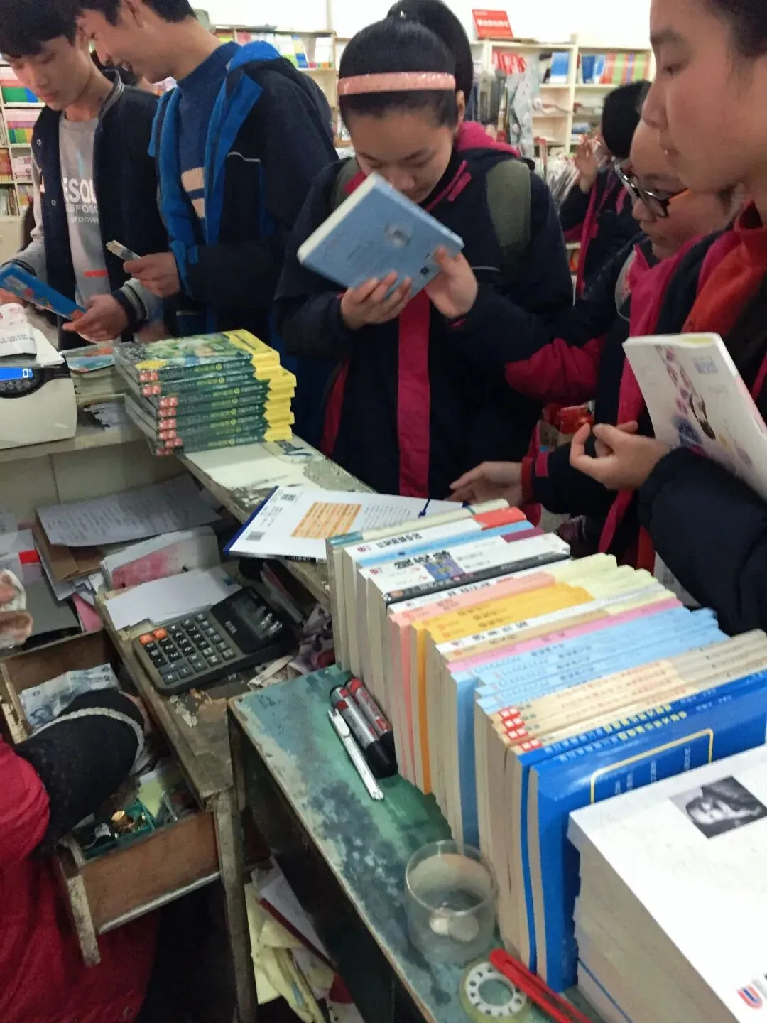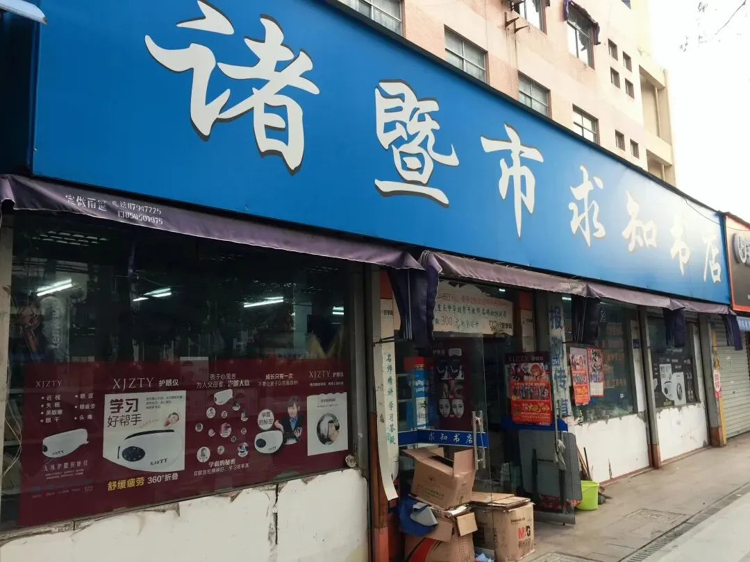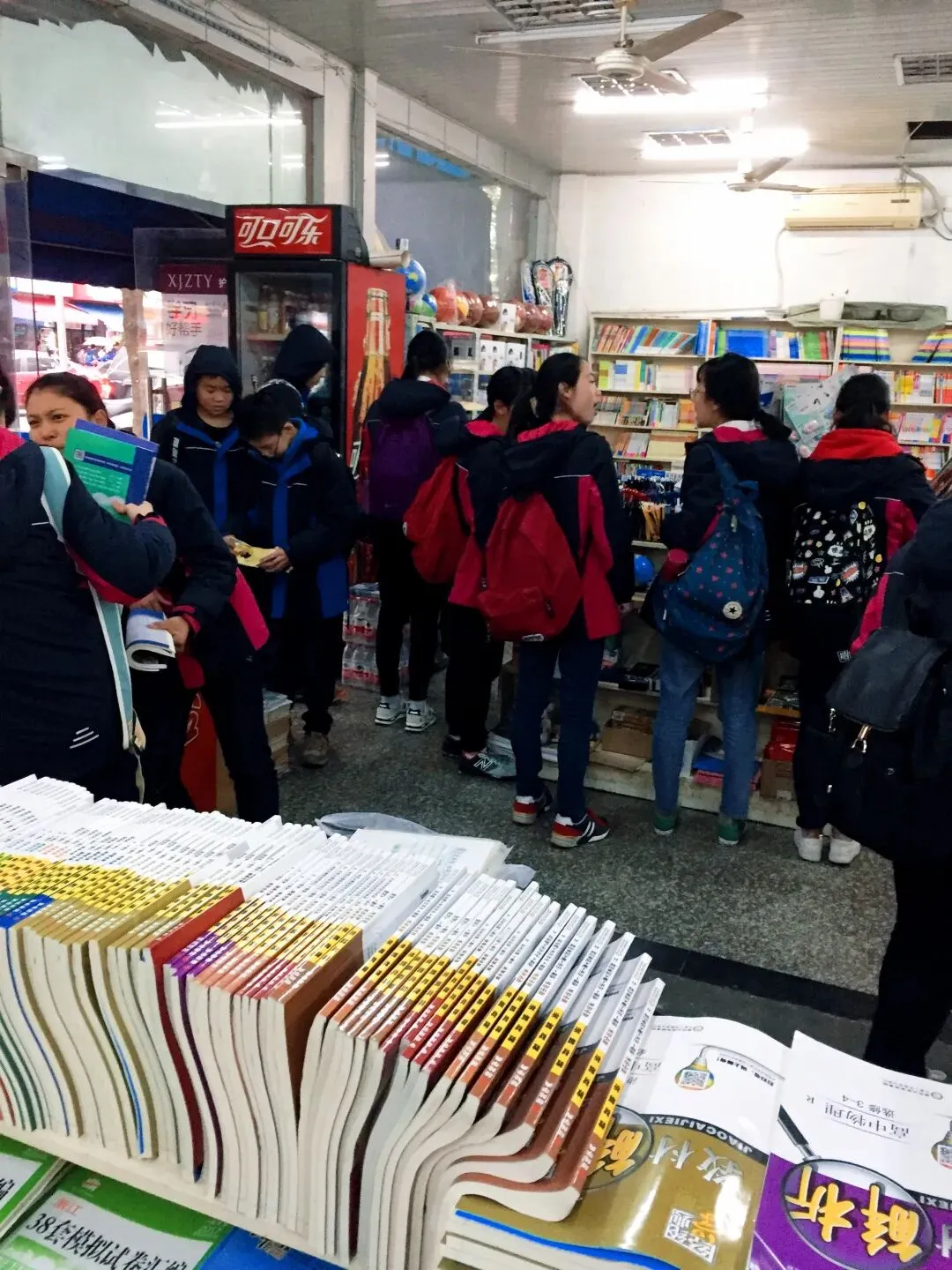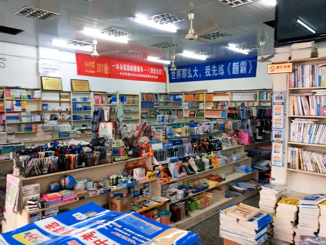 收银台前穿着校服的学生、堆得高高的满架满排书、进门口那台可口可乐售卖机、还有横幅上那句“世界那么大,我先练《题霸》”、绍兴市十佳民营书业,五好经营户……