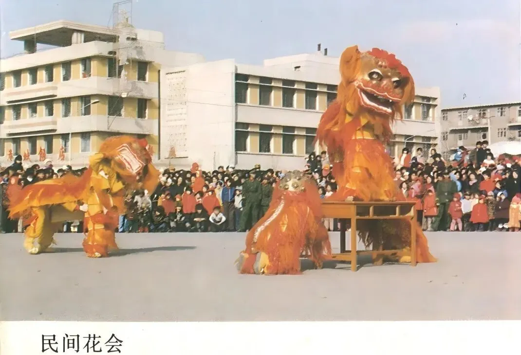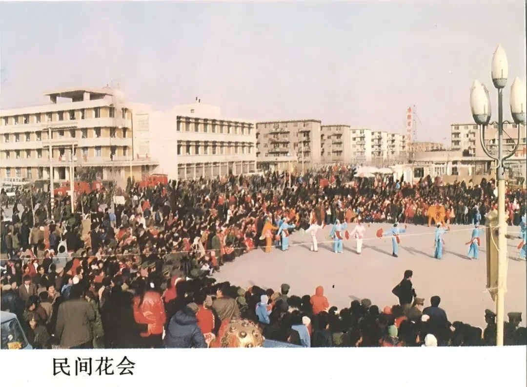 友谊商场招牌右上角后面那个造型独特的花砖墙提供了线索,原来7天酒店就是过去的港城饭店呀(上一期的评论区里也有朋友提到了,以上是我自己此前探寻港城饭店的经过)后续又在书里看到两张背景中有港城饭店的图,发上来供大家欣赏下面这张照片中信息更多,左边是港城饭店,远处竖着的招牌,应该就是前面发胜利副食超市那一期照片里,康乐冷饮的招牌,这个花会的位置,应该就是现在石化俱乐部西边卖小吃的广场欢迎朋友们在评论区分享关于港城饭店的历史和记忆,它是啥时候建成的,又是啥时候改了酒店的,朋友们曾经去港城饭店吃过饭吗?是商务宴请还是亲朋团聚呢?关于最后两图的民间花会,有没有好玩儿有趣的事情呢,我猜想,在这里搞民间花会的时候,大概世纪广场还没有建成吧?