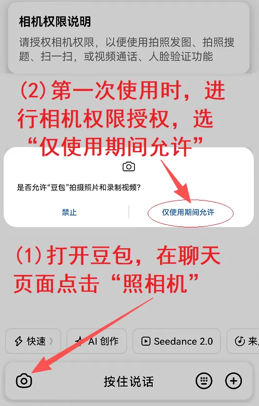 点击左下角的“照相机”图标。第一次使用时,要进行授权,按下图提示方式选择。