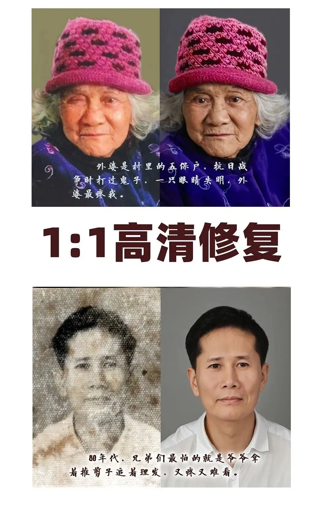 专业修复老照片可支持:提高清晰度/黑白照上色/修复破损/褪色/褶皱/划痕/模糊/发黄/修补/放大/换背景/修改尺寸/小图变大图等等……