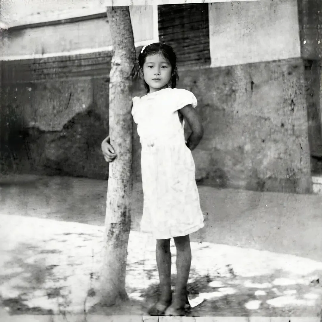 当旧时光的像素重新变得锐利清晰,我看见的不只是一个倚着树干的小小身影,更看见了朋友儿时清丽动人的模样——眼神清澈,纯粹又温柔,藏着那段被阳光照耀、被微风轻拂的温柔岁月。